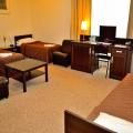 34м². Просторный номер. В номере двуспальная кровать, тумба, кондиционер, диван, кресла, платяной шкаф, письменный стол, телевизор, Wi-Fi, мини-бар, телефон, фен. Санузел: ванна, раковина, унитаз, полотенца, халат, тапочки, косметич. принадлежности.